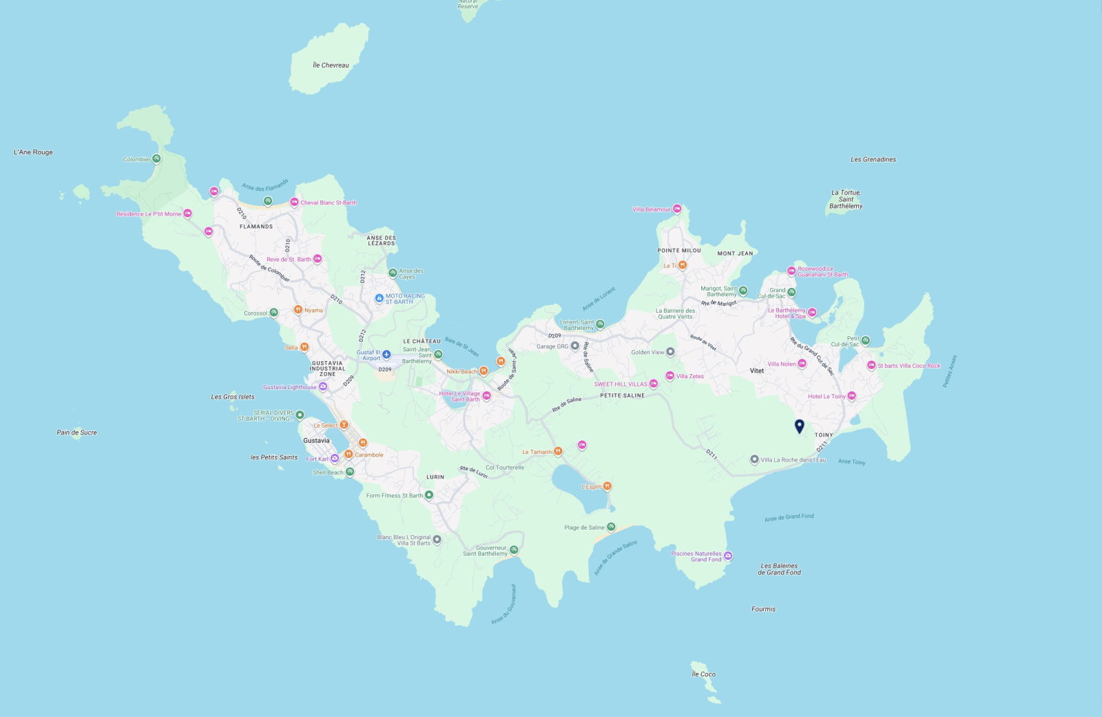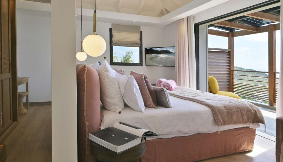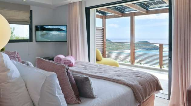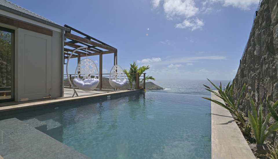 Located on a hillside in the hills above Toiny, Villa Davalia is a tranquil and elegant retreat, ideal for those seeking peace and breathtaking views. The access road can be steep, but once you arrive, you'll be rewarded with a magnificent panorama of the ocean stretching as far as the eye can see. This modern villa boasts a simple yet refined design, featuring two spacious bedrooms, each with a private bathroom, television, air conditioning, Bluetooth speaker, and sea view. One of the bedrooms even has a private terrace and a minibar, perfect for a gentle awakening by the sea.