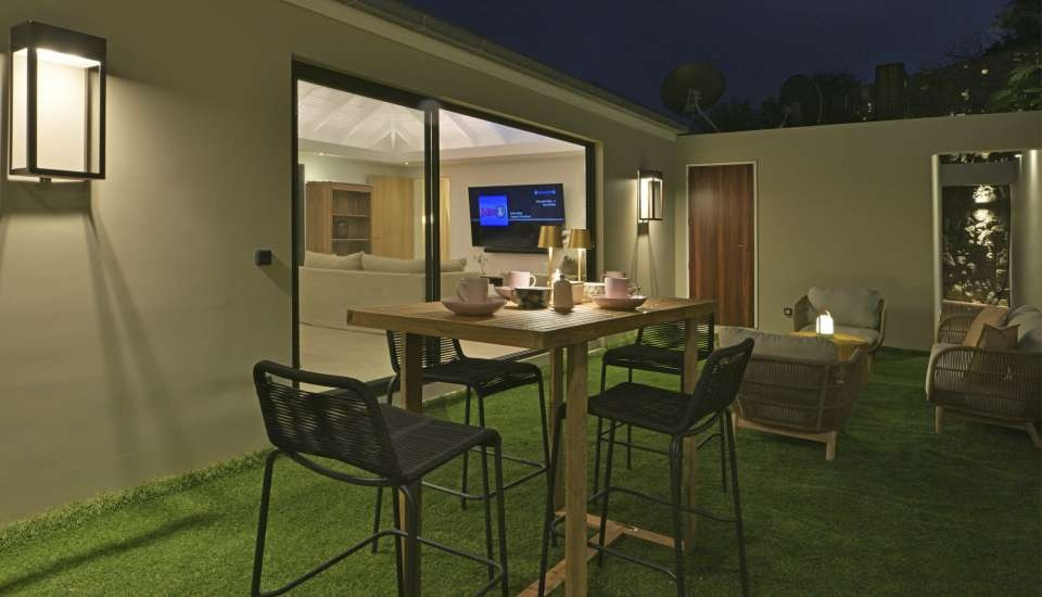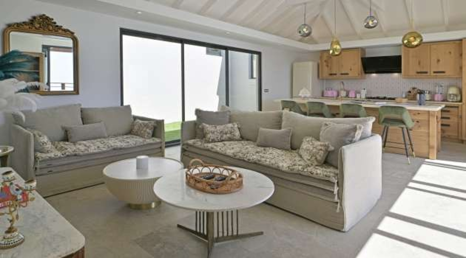 The bright living room overlooks the outside and offers a relaxation area with quality equipment, such as a Sonos system and satellite television.