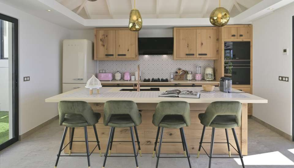 The open-plan kitchen is fully equipped and perfect for those who love good food. Outside, the heated swimming pool awaits, surrounded by sun loungers and a barbecue area for convivial evenings.